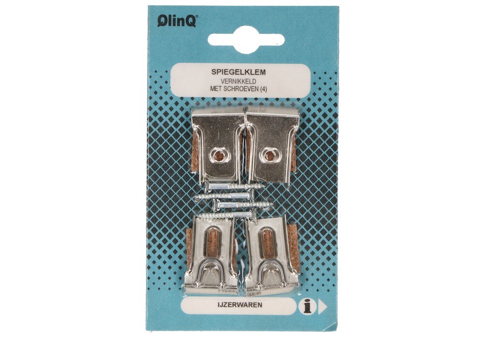 QlinQ® spiegelklemmen roestvaststaal, sets van 4 stuks compleet met bevestigingsmateriaal. De set spiegelklemmen is geschikt voor het bevestigen van een spiegel aan de wand. Monteer de vaste klemmen aan de onderzijde en de klemmen met veerfunctie aan de bovenzijde. Nadat de klemmen zijn gemonteerd kan de spiegel schuin in de bovenste klemmen gestoken worden en vervolgens in de onderste klemmen worden geplaatst.