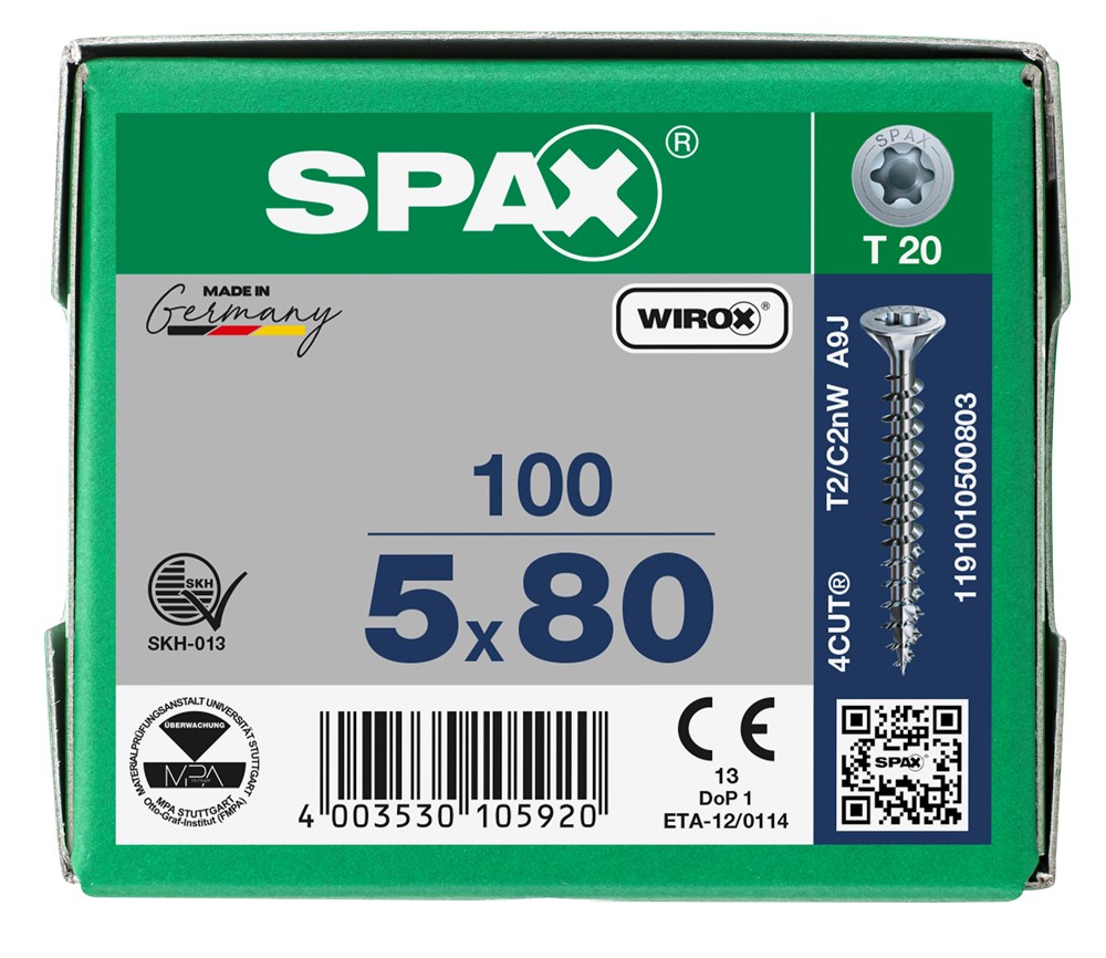 SPAX Spaanplaatschroef, 5.0 x 80 mm, t20, platkop, gegalvaniseerd, verzinkt