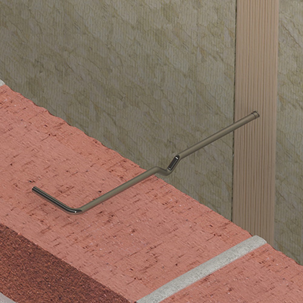 Spouwanker, voorzien van waterhol en houtdraad voor rechtstreekse bevestiging in het hout of met een kraagplug in beton en metselwerk van het binnenblad en aan het uiteinde een haak voor de gemetselde buitenmuur.