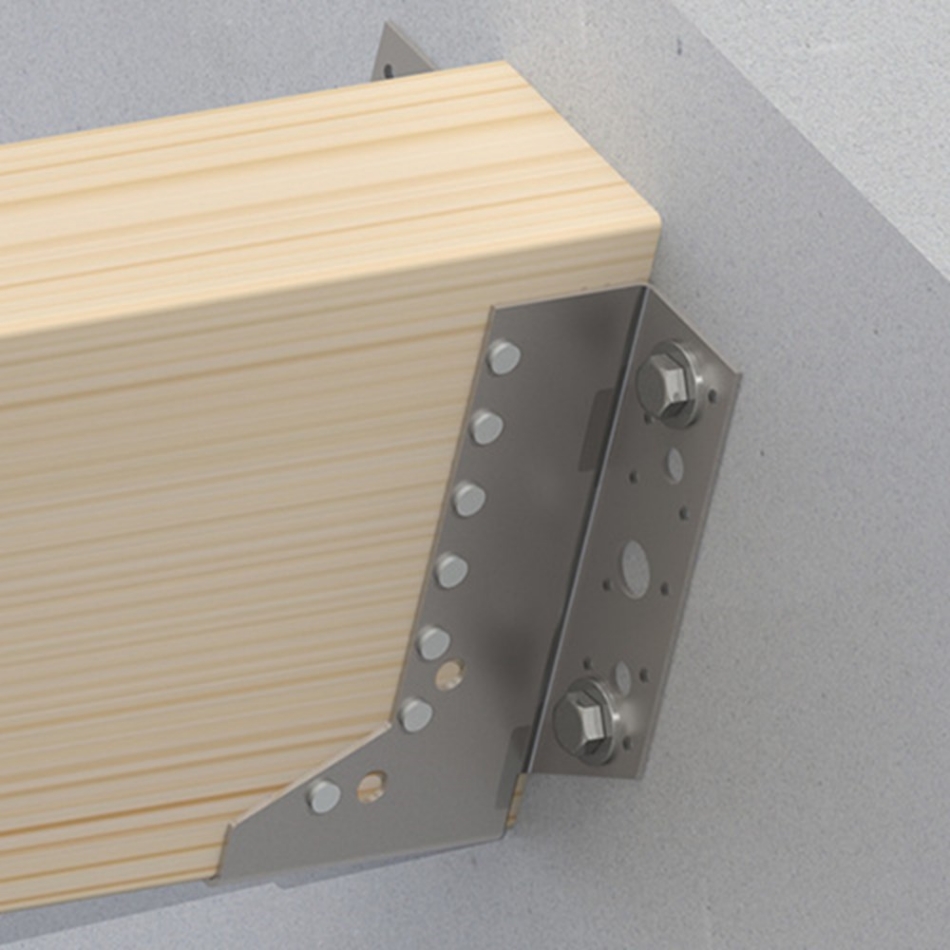 Balkdrager met zijflenzen, voor het bevestigen van dwarsbalken rechtstreeks tegen de muur of tegen een andere houten balk. Deze balkdrager wordt ook toegepast voor het maken van ravelingen in vloeren en daken. Leverbaar voor de gangbare kopmaten van zowel geschaafd als ongeschaafd hout.