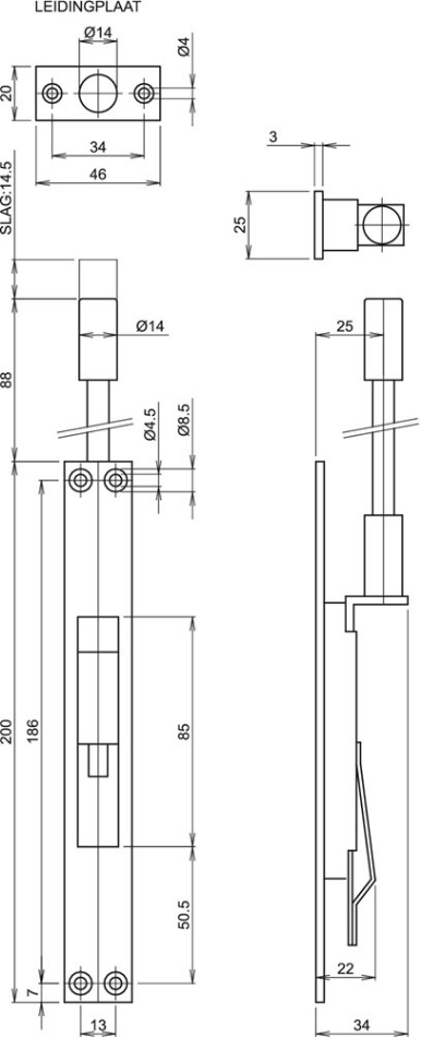 Voor metalen deuren, de stang kan na montage onder en boven in de deur worden gestoken en vastgedraaid
