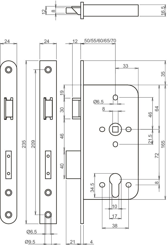 LIPS Veiligheidsdeurslot, PC-uitsparing 2422, doornmaat 50 mm, zonder sluitplaat, pc-72, rvs