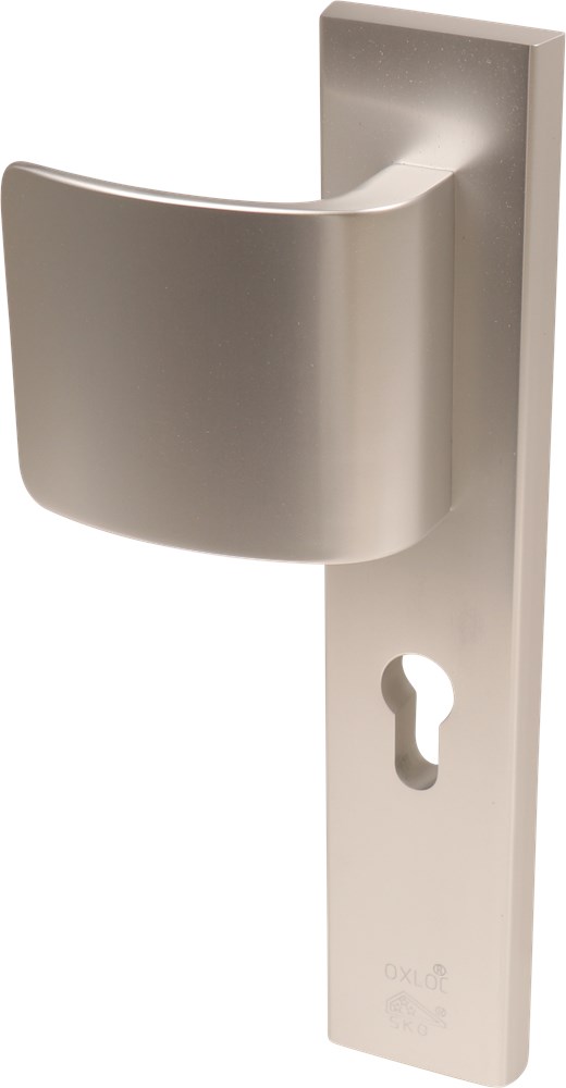 Rechthoekig model. Dikte buitenschild 12 mm en dikte binnenschild 8 mm. Afmeting schild 251x50 mm. Met omkeerbare deurduwer 90x80 mm en kruk.