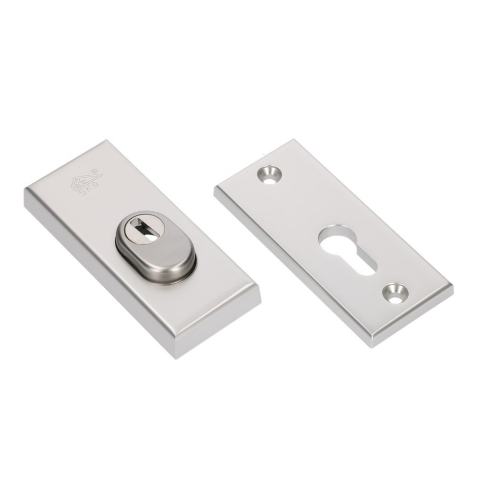 Rechthoekig model, aluminium geanodiseerd. Buitenrozet voorzien van rvs kerntrekbeveiliging. Dikte buitenrozet 15 mm en dikte binnenrozet 8 mm. Afmetingen rozet 115x50 mm. Met blinde bevestiging van binnenuit d.m.v. twee metaalschroeven M6x53 mm.