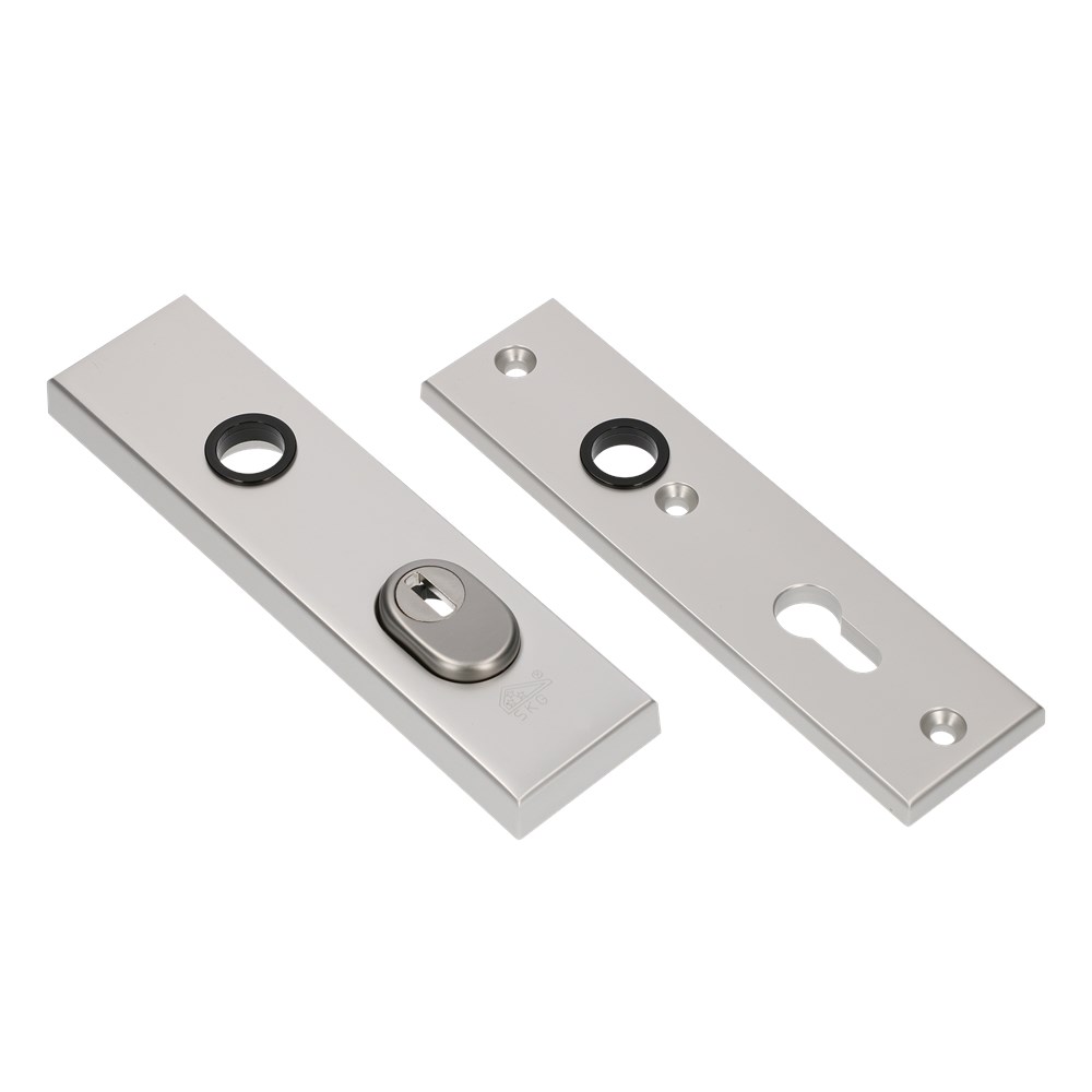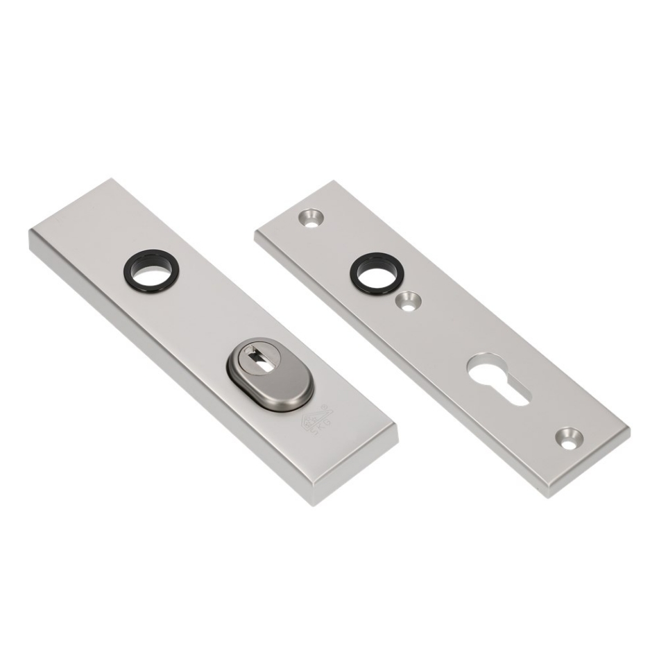 Rechthoekig model, aluminium geanodiseerd. Buitenschild voorzien van rvs kerntrekbeveiliging. Dikte buitenschild 15 mm en dikte binnenschild 8 mm. Afmeting schild 193x50 mm. Met blinde bevestiging van binnenuit d.m.v. drie metaalschroeven M6x53 mm.
