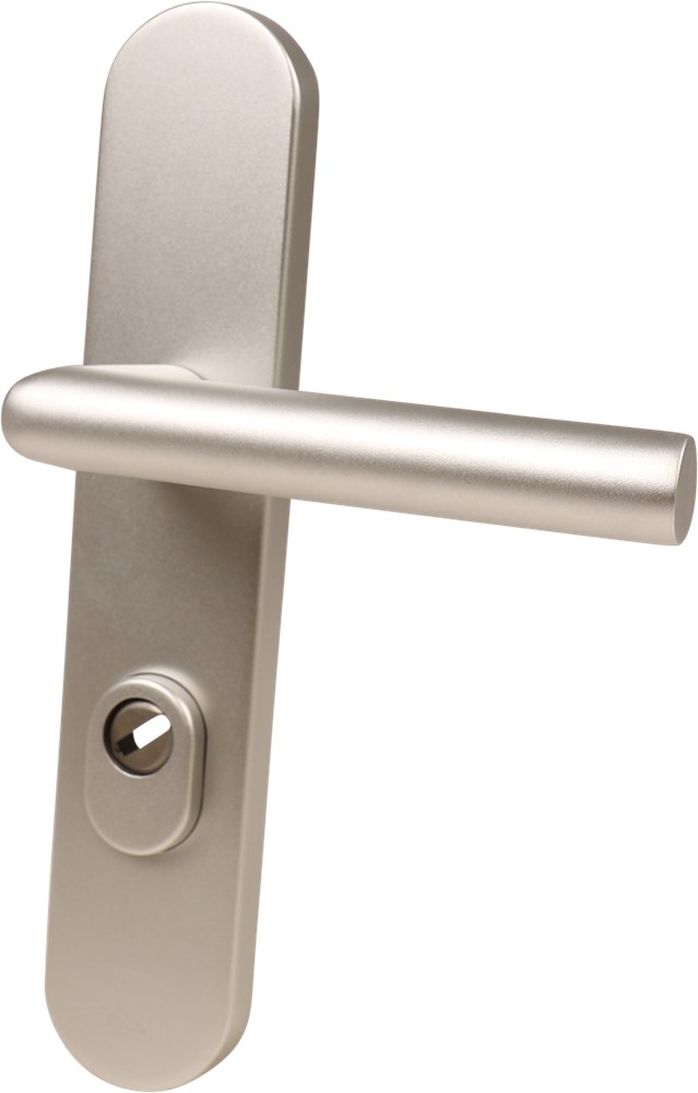 Veiligheidsgarnituur Oxloc aluminium F1 250x50mm deurdikte = 38-42mm kruk/kruk omkeerbaar. Kruk vastdraaibaar op ovaal schild met kerntrekbeveiliging SKG***