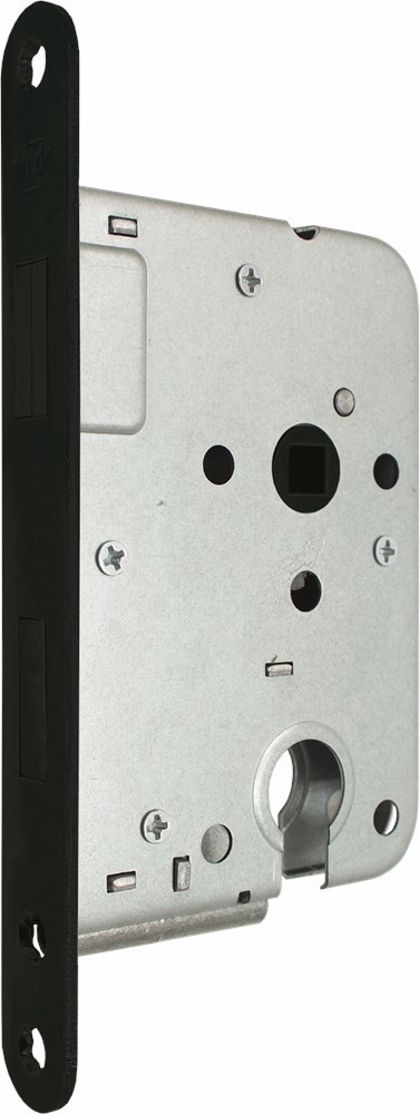 Magneet serie profielcilinder dag- en nachtslot, geschikt voor woningbouw. Stalen dagschoot, dat naar buiten getrokken wordt door bij behorende magnetische sluitplaat, zamak nachtschoten, krukgat 8 mm en kruk-/cilindergat h.o.h. 55 mm. Dichte verzinkte slotkast van 122x80x17 mm. Voorzien van afgeronde voorplaat 174x20x2,75 mm.