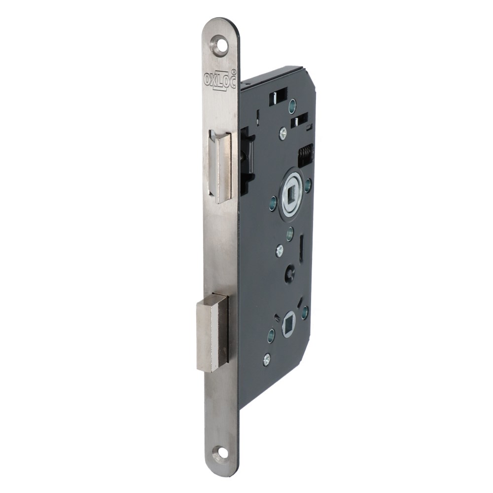 Zware serie insteekslot, geschikt voor utiliteitsbouw. Zamak dag-/nachtschoten omlegbaar (links en rechts bruikbaar) met gelagerde klemtuimelaar. Krukgat 8 mm en kruk-/krukgat h.o.h. 72 mm. Dichte verzinkte, antraciet gelakte slotkast van 165x92,5x16 mm. Voorzien van afgeronde voorplaat 235x20 mm.