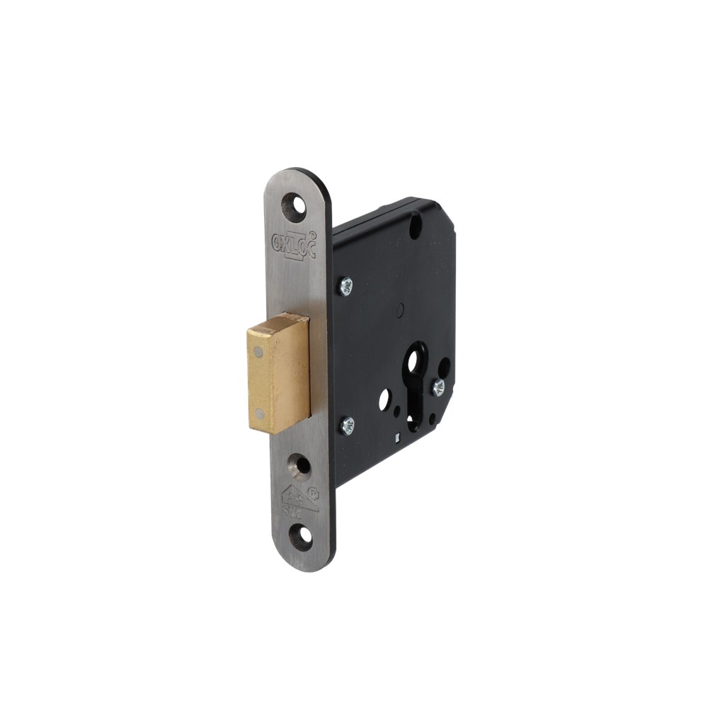 Zware serie profielcilinder insteekslot, geschikt voor utiliteitsbouw. Messing nachtschoot met 2 stalen beveiligingspennen. Dichte antraciet gelakte slotkast van 86x88,5x16,5 mm. Voorzien van afgeronde voorplaat 140x25x4 mm.
