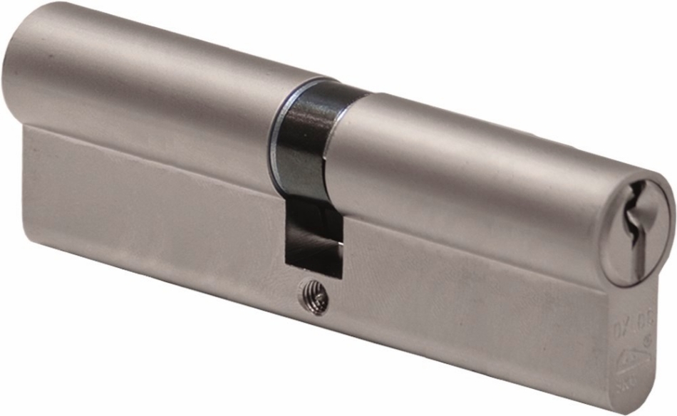Veiligheidseuroprofielcilinder 17 mm, mat vernikkeld, 5 permutatiestiften en een boorbelemmering aan beide zijden.