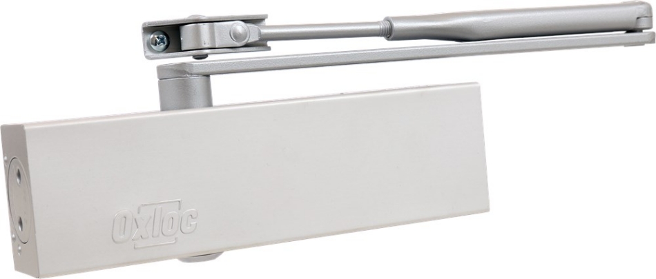Deurdranger met schaararm EN 2-4, type OX200 in zilvergrijze uitvoering. Geschikt voor binnen- en buitendeuren. Deze deurdranger beweegt mee met de werking van de deur, dus bij uitstek geschikt voor (oudere) kozijnen, werkende/knellende deuren, etc.