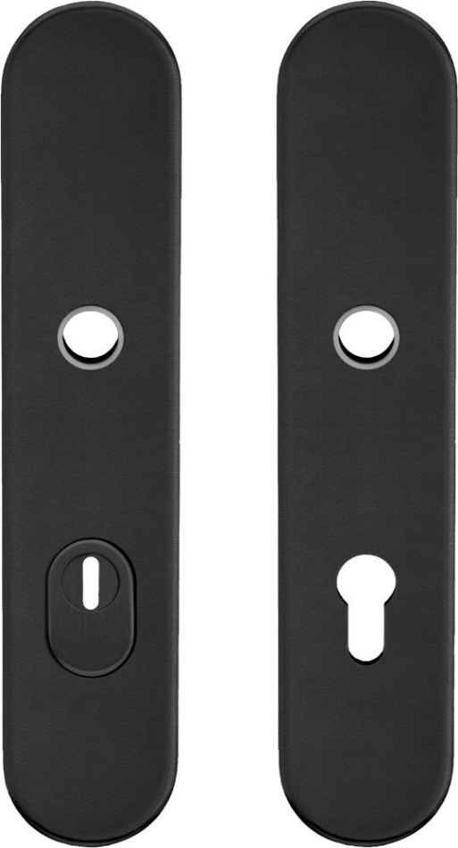 Ovaal model. Rvs AISI 304 (A2), mat zwart. Buitenschild voorzien van voorzien van kerntrekbeveiliging. Dikte buitenschild 14,5 mm en dikte binnenschild 6,5 mm. Buitenschild en binnenschild met kruk-/ profielcilindergat. Afmeting schild 254,5x52 mm.