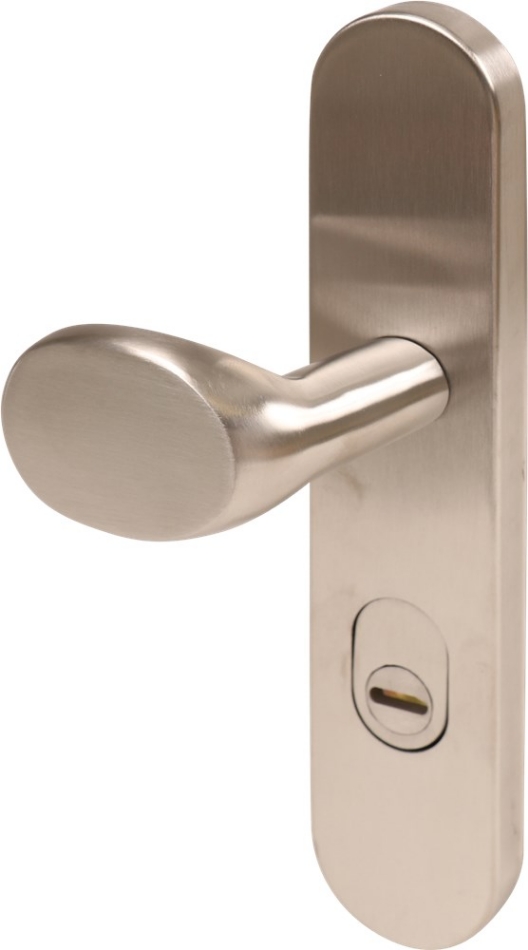 Ovaal model. Rvs AISI 304 (A2). Buitenschild voorzien van voorzien van kerntrekbeveiliging. Dikte buitenschild 14,5 mm en dikte binnenschild 6,5 mm. Buitenschild deurduwer 89x53 mm / profielcilindergat en binnenschild met kruk-/ profielcilindergat. Afmeting schild 254,5x52 mm.