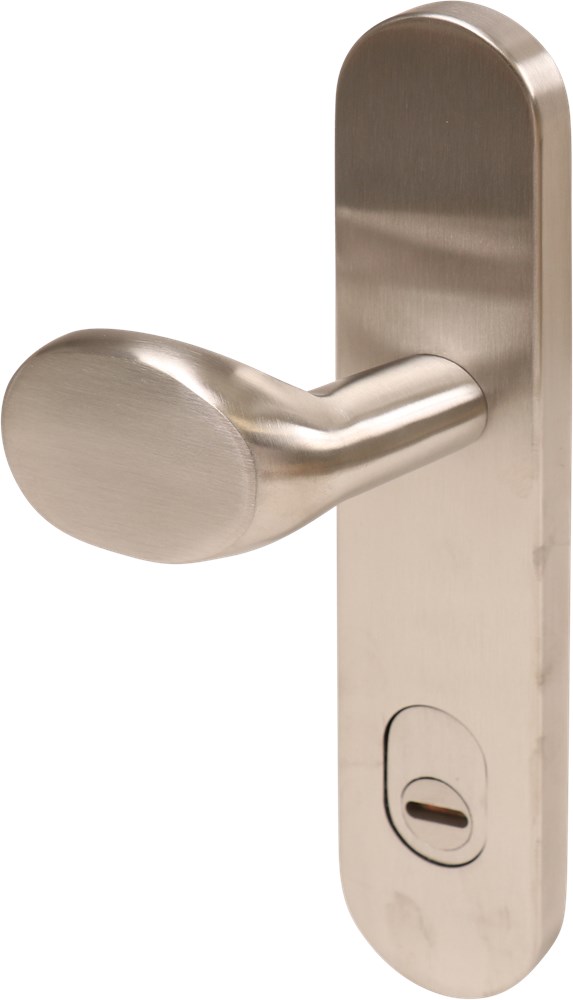 Ovaal model. Rvs AISI 304 (A2). Buitenschild voorzien van voorzien van kerntrekbeveiliging. Dikte buitenschild 14,5 mm en dikte binnenschild 6,5 mm. Buitenschild deurduwer 89x53 mm / profielcilindergat en binnenschild met kruk-/ profielcilindergat. Afmeting schild 254,5x52 mm.