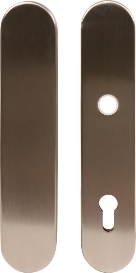 Ovaal model. Rvs AISI 304 (A2). Dikte buiteschild 14,5 mm en dikte binnenschild 6,5 mm. Buitenschild geheel blind en binnenschild met kruk-/ profielcilindergat. Afmeting schild 254,5x52 mm.
