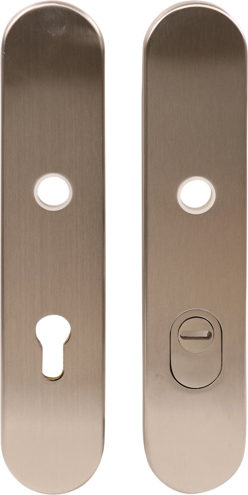 Ovaal model.Rvs AISI 304 (A2). Buitenschild voorzien van kerntrekbeveiliging. Dikte buitenschild 14,5 mm en dikte binnenschild 6,5 mm. Buitenschild met kruk-/ profielcilindergat en binnenschild met kruk-/ profielcilindergat. Afmeting schild 254,5x52 mm.