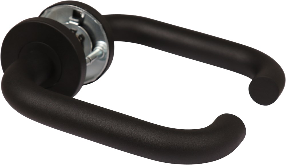 Model Coevorden (D-model deurkruk). Rvs AISI 304 (A2), zwart. Voorzien van stalen onderrozet geveerd. Brandwerend N1906 klasse 3 / EN1634.