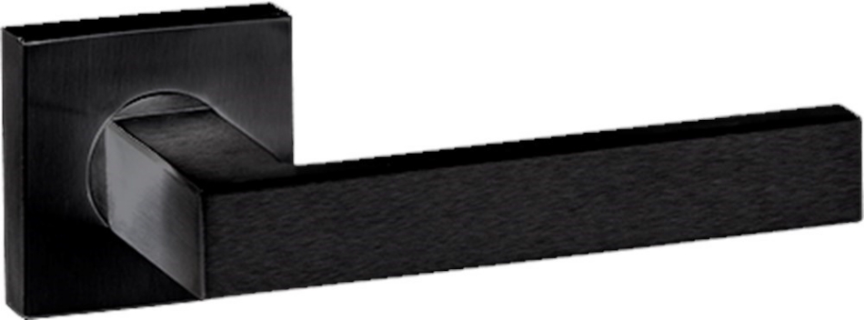 Model Tiel (Haaks-model deurkruk). Vierkant rozet. Rvs AISI 304 (A2), zwart. Voorzien van kunststof onderrozet geveerd.