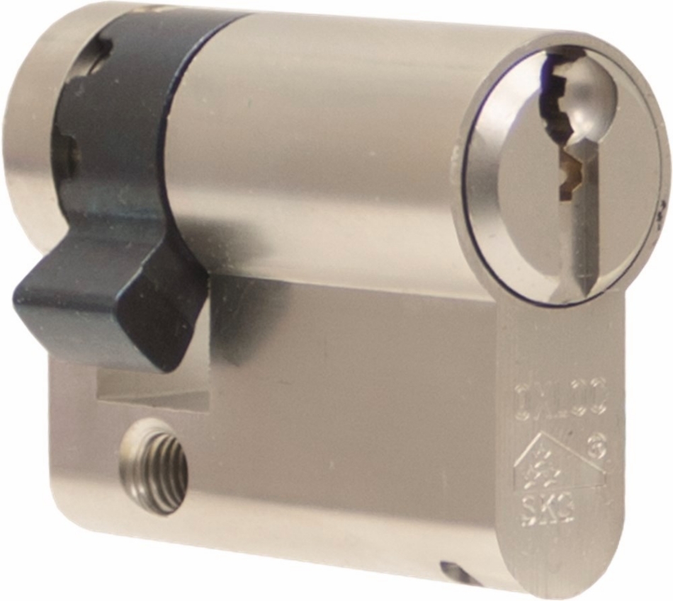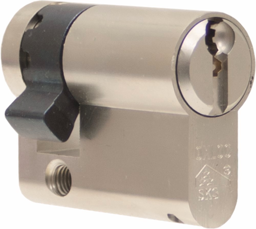Veiligheidseuroprofielcilinder, 17 mm mat vernikkeld. Met 14 mm kern, 6 permutatiestiften, boorbelemmering en kerntrekbeveiliging.