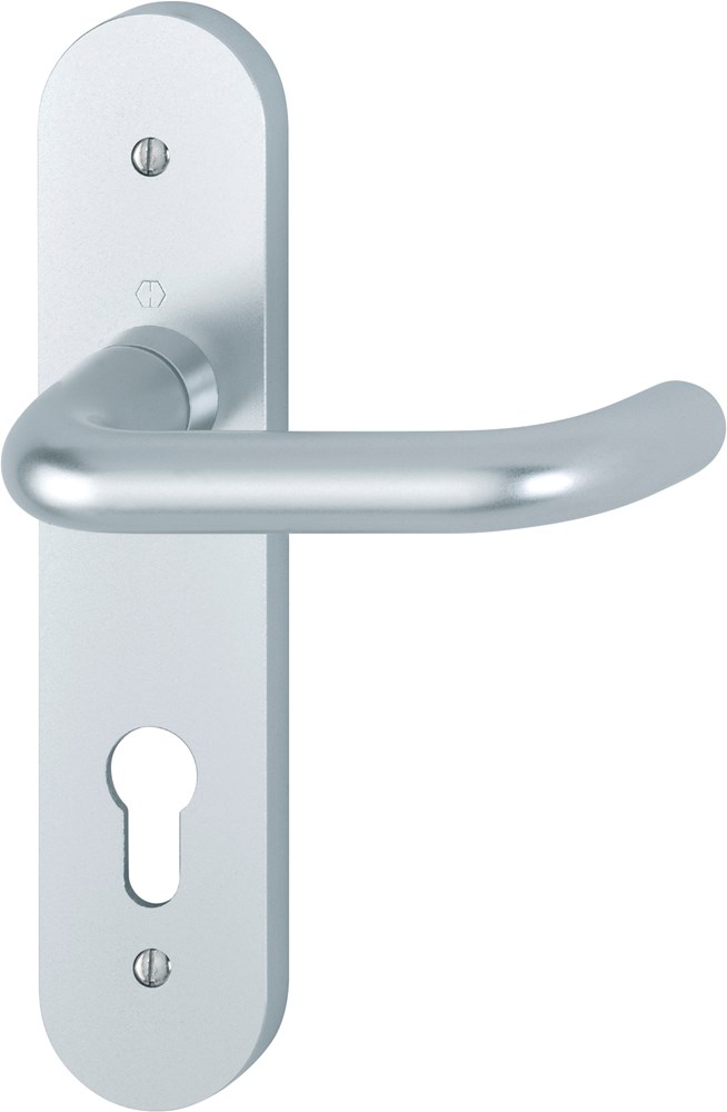 HOPPE afgerond binnendeurgarnituur, gegoten schilden met vast/draaibaar-gelagerde deurkrukken en krukveer-mechanisme en deurkrukken met massieve stift, zichtbare bevestiging, inclusief bevestigingsmateriaal.