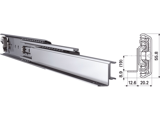 Type Ulf HD E - TR-5620. Drie-delige geleider tot 110% uittrekbaar met ladedrager en fail-safe (intrekmechanisme).