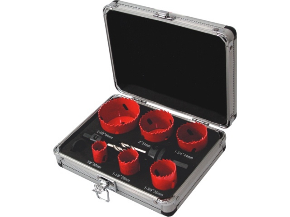 9-delig. Bestaande uit gatzagen 22, 29, 35, 44, 51 en 64 mm, 2 gatzaaghouders en 1 verloopnippel.