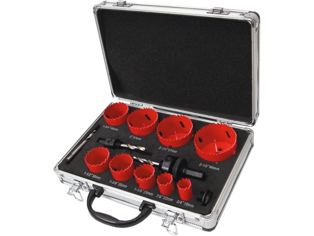 13-delig. Bestaande uit gatzagen 19, 22, 29, 35, 38, 44, 51, 57 en 64 mm, 2 gatzaaghouders, 1 verloopnippel en extra centreerboor.