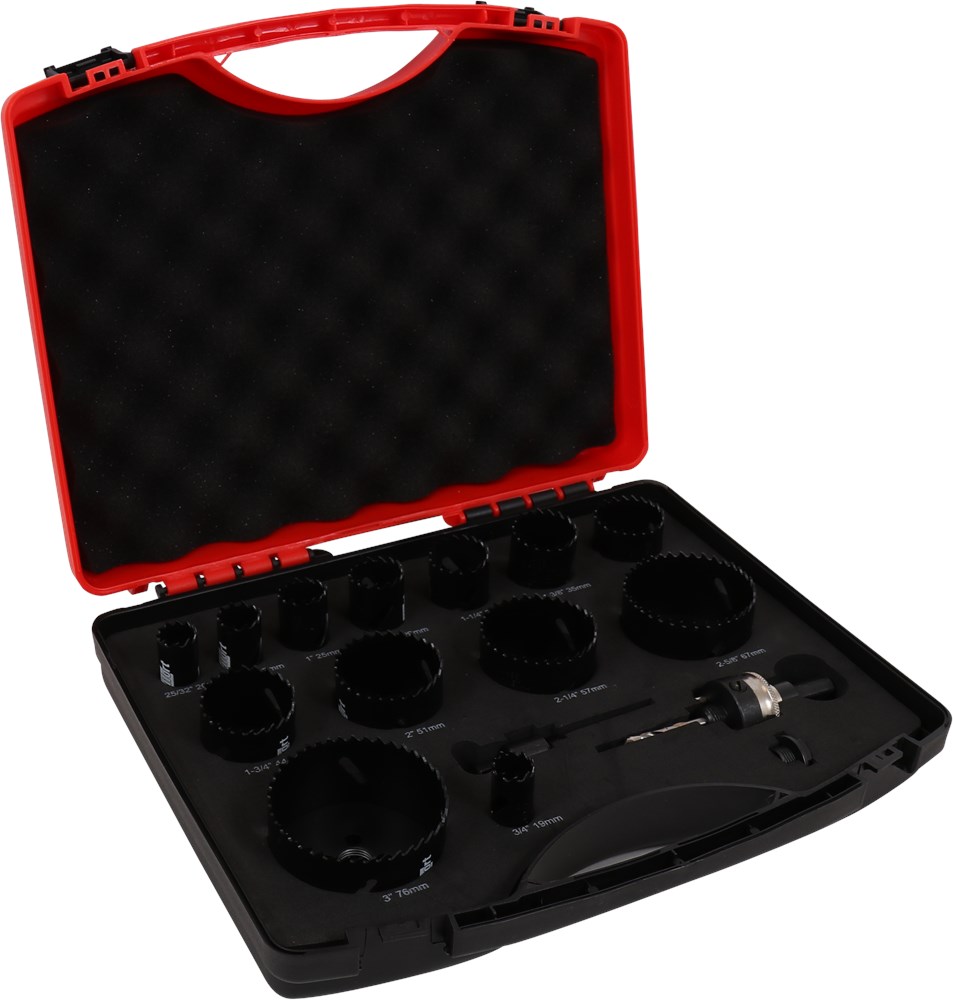 16-delig. Bestaande uit gatzagen 19, 20, 22, 25, 29, 32, 35, 38, 44, 51, 57, 67 en 76 mm, 2 gatzaaghouders en 1 verloopnippel.