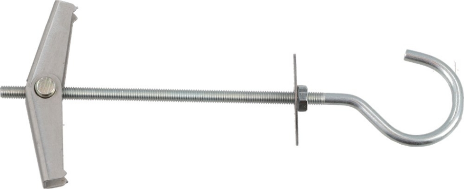 Deze verzinkte tuimelplug is geschikt voor holle wanden. De verende metalen pluggen hebben lange draadstangen waarmee ze grote wanddiktes overbruggen.