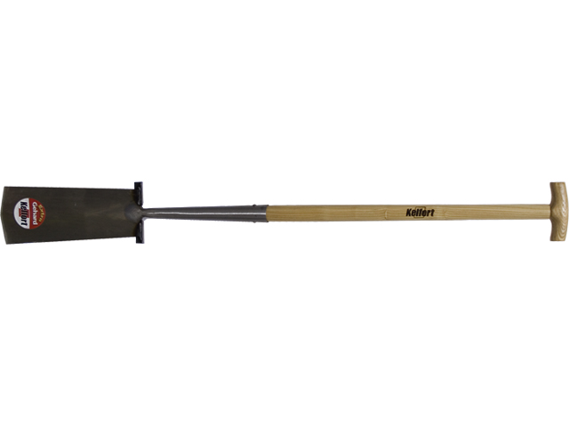 Voorzien van een spanningsvrij 3 mm gehard stalen blad, met opstapje, afgerond. Eerste kwaliteit gelakte essen steel van 950 mm, met T-greep.