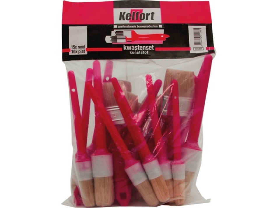 Assortiment voor eenmalig gebruik, bestaande uit 15 ronde en 10 platte kwasten van wit varkenshaar. Voor verf op waterbasis.