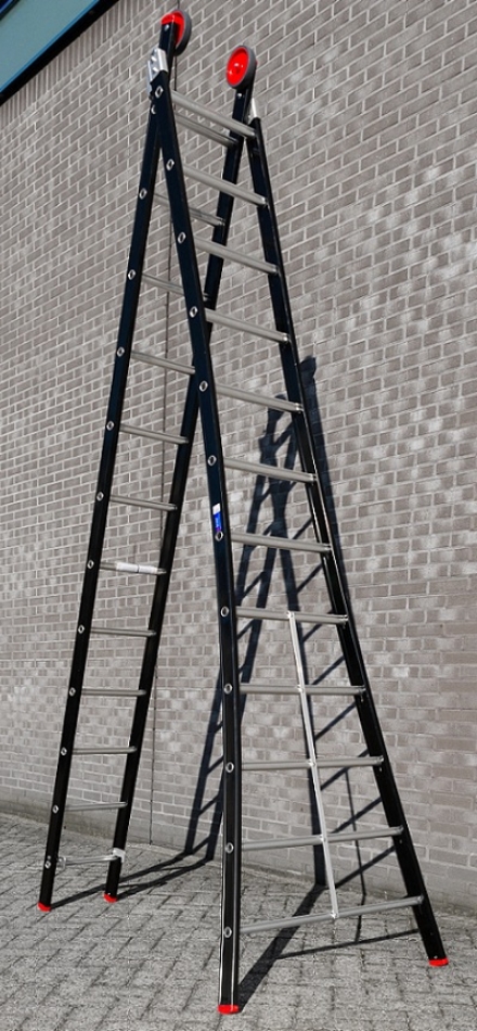 Model Magnus. 2-delige, professionele zwart polyester gecoate reformladder voorzien van uitgebogen bomen. De trapbomen bestaan uit een naadloos geëxtrudeerd aluminium kokerprofiel met aan de binnenzijde een smal gedeelte waartussen de sporten zijn ingeklemd. Met brede 28 mm sporten en tussen elke sport 250 mm afstand. De sport is aan de onderkant afgerond en aan de bovenkant vlakgeribd als een antislipbeveiliging.