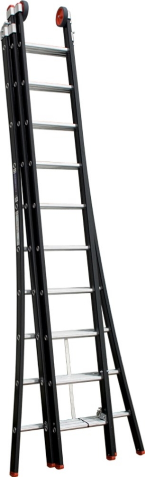 Model Magnus. 3-delige, professionele zwart polyester gecoate opsteekladder voorzien van uitgebogen bomen en spreidbeveiliging. De trapbomen bestaan uit een naadloos geëxtrudeerd aluminium kokerprofiel met aan de binnenzijde een smal gedeelte waartussen de sporten zijn ingeklemd. Met brede 28 mm sporten en tussen elke sport 250 mm afstand. De sport is aan de onderkant afgerond en aan de bovenkant vlakgeribd als een antislipbeveiliging.