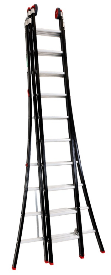 Model Magnus. 3-delige, professionele zwart polyester gecoate reformladder voorzien van uitgebogen bomen en starre spreidbeveiliging. De trapbomen bestaan uit een naadloos geëxtrudeerd aluminium kokerprofiel met aan de binnenzijde een smal gedeelte waartussen de sporten zijn ingeklemd. Met brede 28 mm sporten en tussen elke sport 250 mm afstand. De sport is aan de onderkant afgerond en aan de bovenkant vlakgeribd als een antislipbeveiliging.