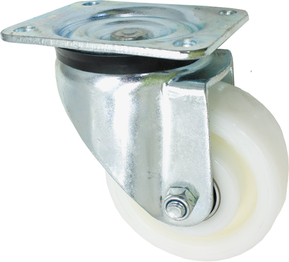 Elektrolytisch verzinkt met plaat. Wit polyamide loopvlak met rollager.