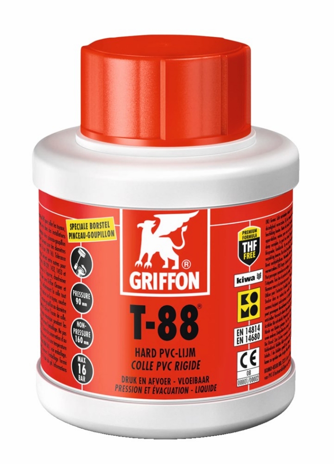 Snelle, vloeibare, THF-vrije hard PVC-lijm voor het verlijmen van buizen, moffen en fittingen met nauwe passing in druk- en afvoersystemen. Geschikt voor diameters ≤ 160 mm (druk ≤ 90 mm). Max. 16 bar (PN 16). Maximale tolerantie 0,3 mm spleetpassing / 0,2 mm perspassing.