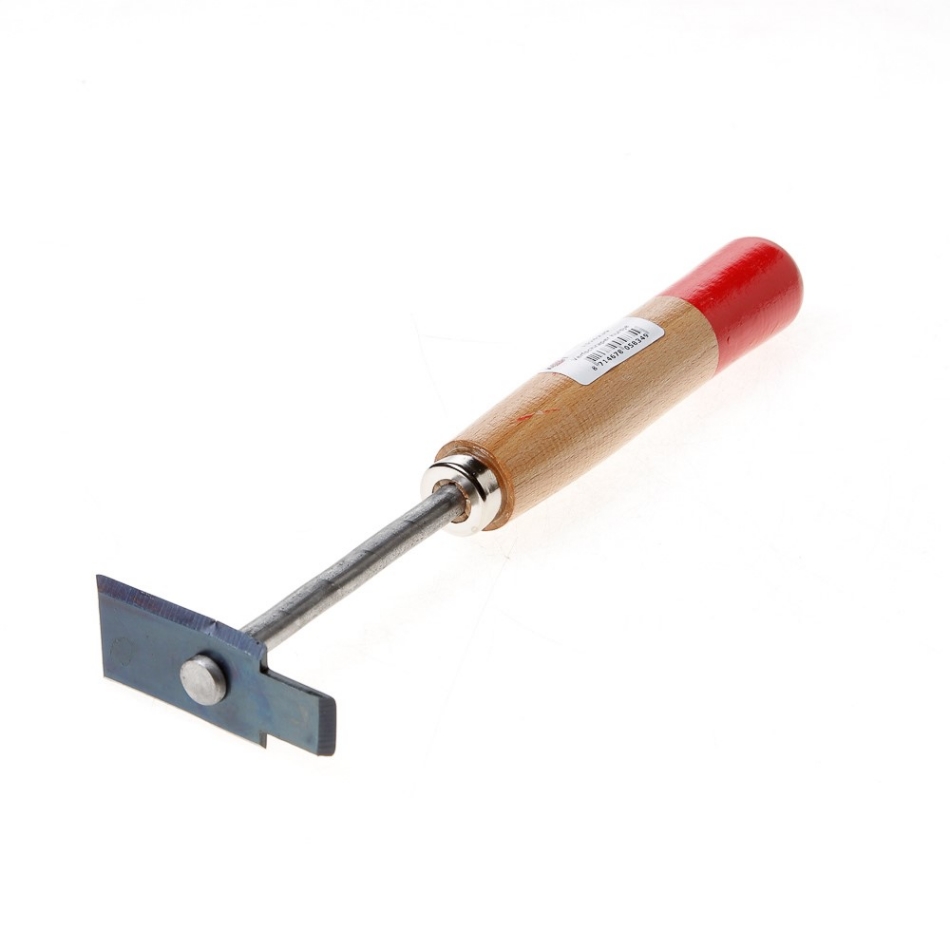 Gehard en geblauwd gereedschapstalen blad met blank gelakt houten heft.