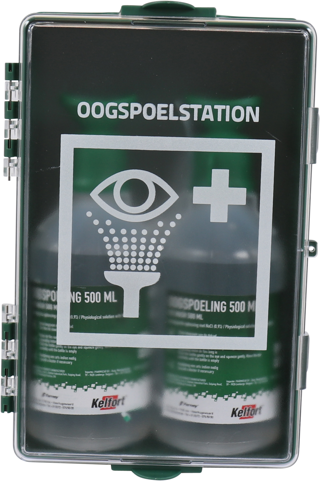 Dit station met wandhouder bevat 2 flacons van de Kelfort oogdouche.