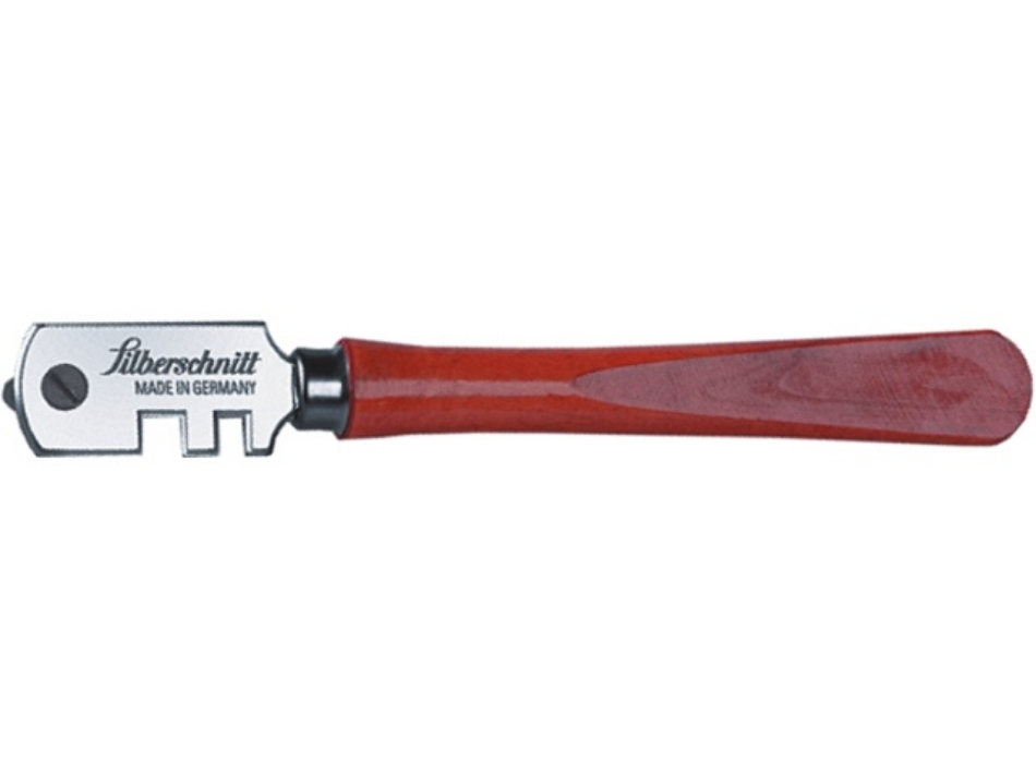 Glassnijder Silberschnitt voorzien van gelakt, houten heft. Zes edelstalen snijwieltjes in geharde en vernikkelde rozet. Geschikt voor algemeen glassnijwerk. Reservewieltjes en een rozet, compleet met 6 wieltjes zijn los leverbaar.
