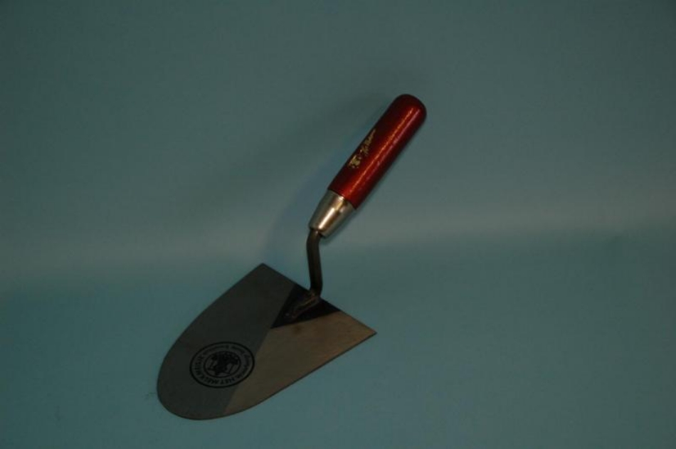 Het Melkmeisje metseltroffel Arnhems model met een blank geslepen blad en rood gelakt houten handvat.