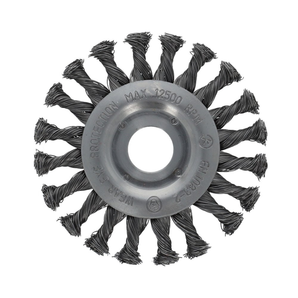 Rondborstels voor de haakse slijper. De Industrial Line met getordeerd staaldraad is geschikt voor het ontroesten en ontbramen van laag- en ongelegeerde staalsoorten.