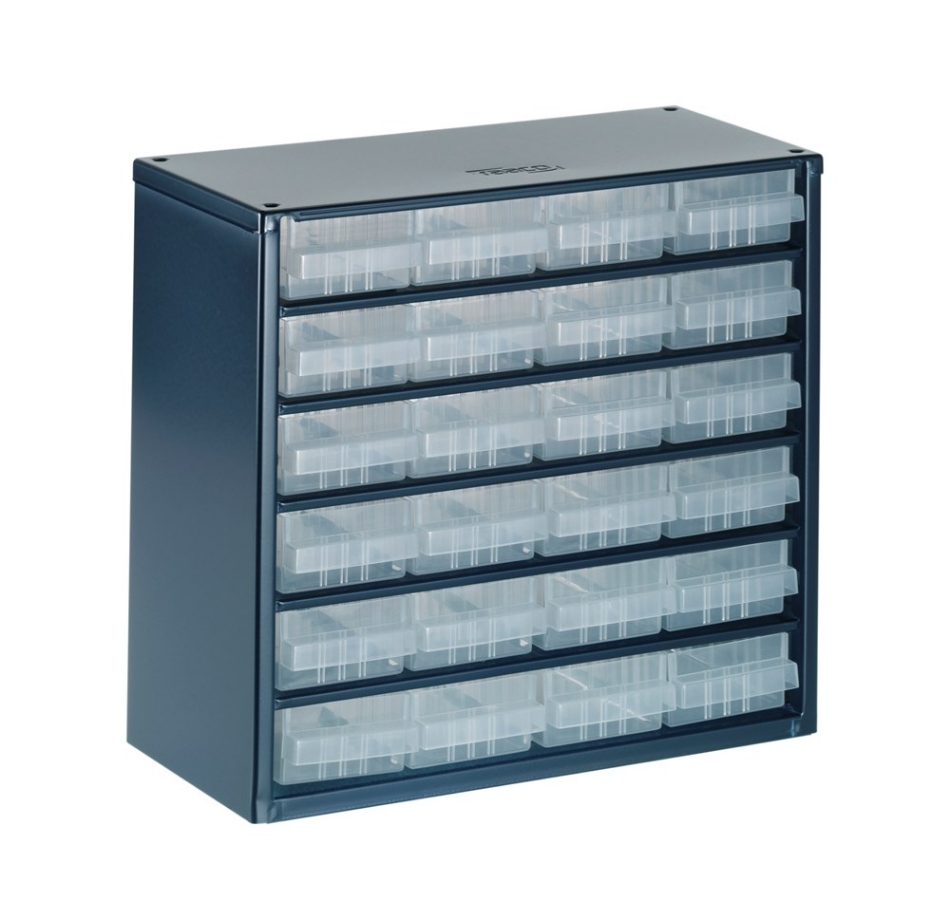 Kast met 24 laden, type 150-01. Elke lade kan in 16 vakken worden verdeeld. Kast van staal en laden van polypropyleen (PP).
