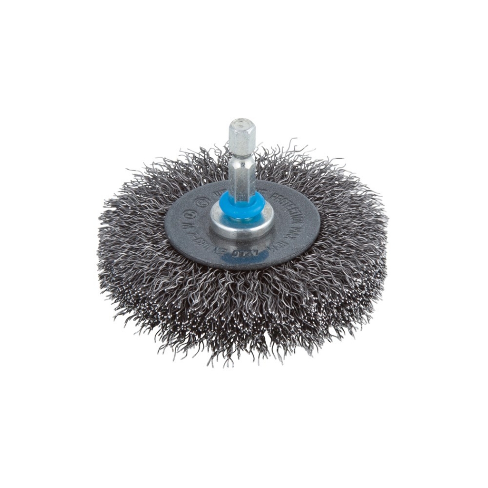 Staaldraad-schijfborstel. Ø 75 mm. Hoogte bezetting 16 mm. Schacht zeskant. Lengte draad 17 mm. Voor ontroesten en reinigen . Ter voorbereiding van soldeer- en laswerkzaamheden. Goed geschikt Metaal, Plaat . Voorwaardelijk geschikt Non-ferrometaal, hout, Steen