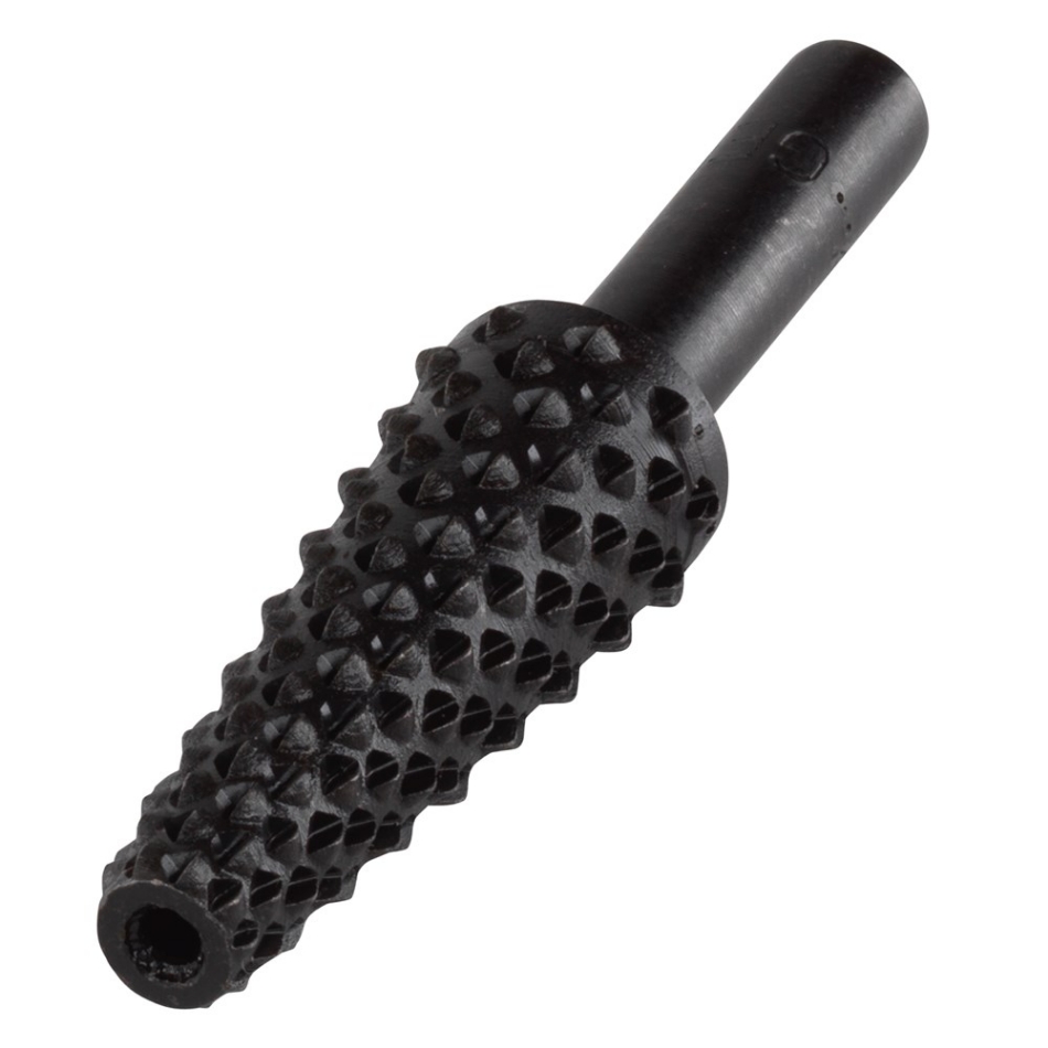 Profielrasp voor hout. Conisch 35 mm. Schachtdiameter 6,35 mm. Rond. Rechtsdraaiend. Toerental max. 3.000 RPM. Gereedschapsstaal. Voor het voorbereiden van sleuven en voor het snel afbreken van materiaal. Goed geschikt Zacht hout, Hardhout, Houten balken