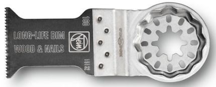 E-Cut Long-Life-zaagblad SL 50x35 - Bimetaal met geschrankte houtvertanding voor alle hout-, gipsplaat- en kunststof materialen. Uitstekende levensduur, hoge zaagkwaliteit en een goede zaagsnelheid. Uiterst robuust, ook ongevoelig voor spijkers die in hout zitten (tot ca. Ø 4 mm), metselwerk enz.