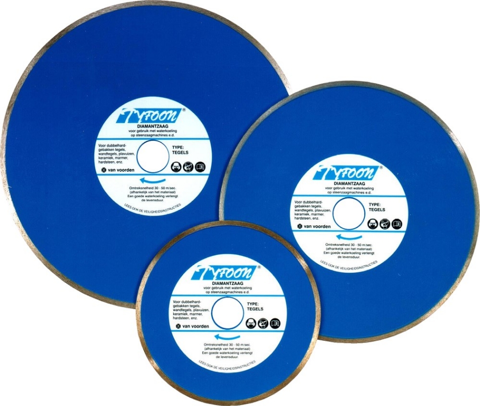 Diamantzagen met waterkoeling, speciaal voor harde wand- en vloertegels, geglazuurde materialen e.d.. Leverbaar in het type "VB" (volle band) voor zaagsneden zonder karteling en het type "SG" (smalle gleuven) met insnijdingen in het stamblad. Beide typen staan borg voor een perfecte afwerking van de zaagkanten.