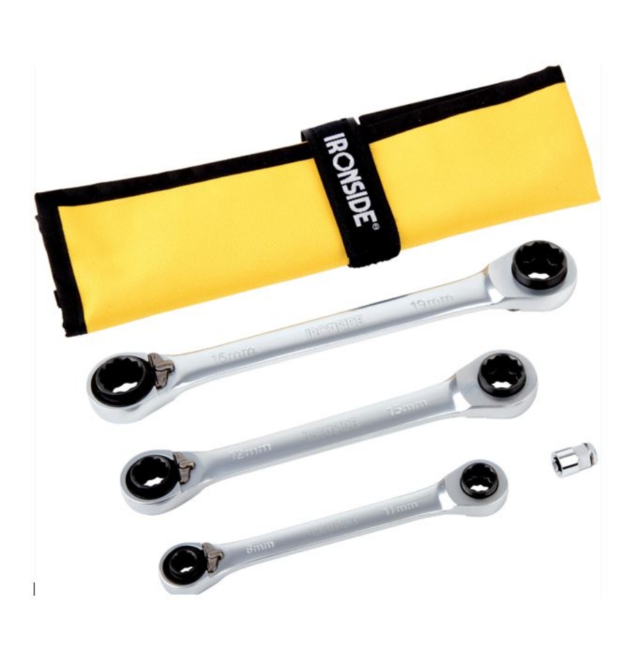 Chroom-vanadiumstaal met omstelbare 72-tands ringratel. 3 ringratels met 4 ringmaten per ringratel 8x9 / 10x11, 12x13 / 14x15 en 16x18 / 17x19 mm.