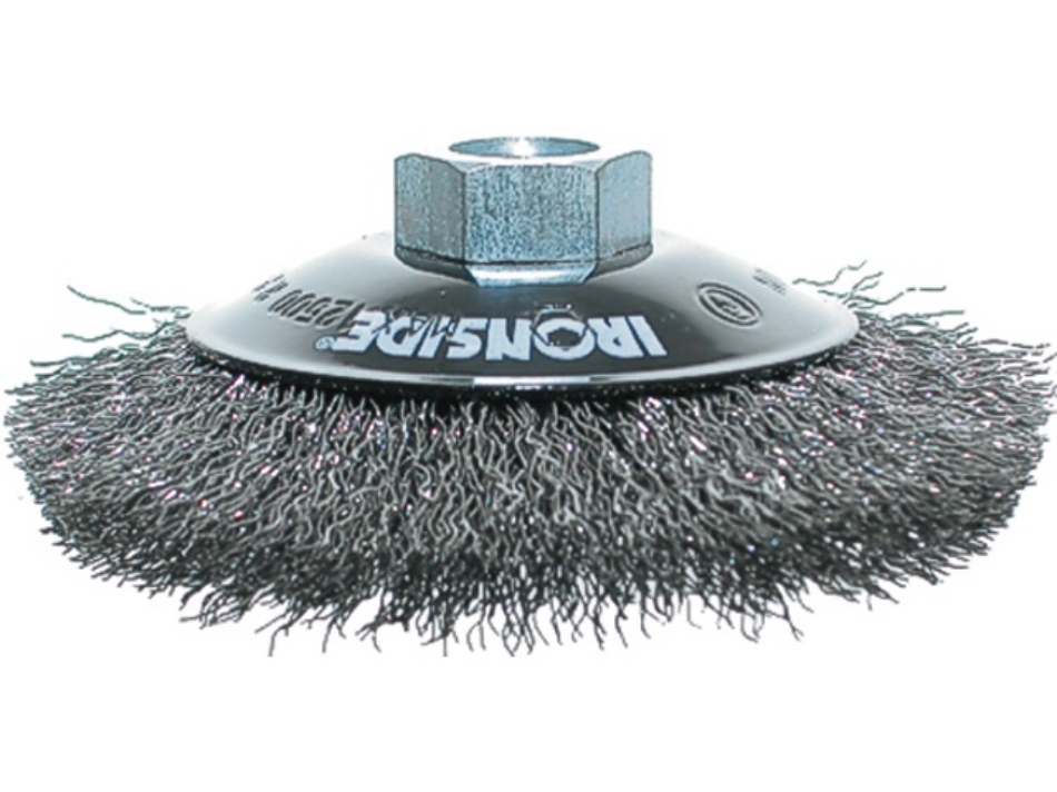 Gegolfd staaldraad, draaddikte 0,3 mm en breedte 10 mm. Asgat M14. Geschikt voor haakse slijper.