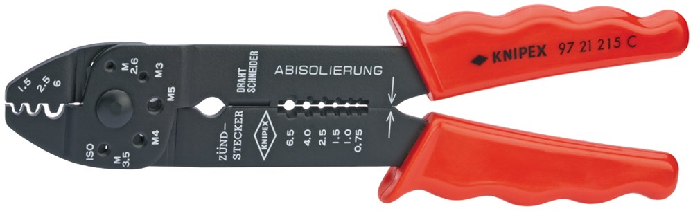 Voor het knippen van kabels, het afstrippen van draden en het krimpen van geïsoleerde en niet-geïsoleerde kabelschoenen en aansluitstekkers en open aansluitstekkers. Met schroefdraadgaten voor het knippen van Cu- of Ms-schroefdraadpennen met M 2,6. 3,0. 3,5. 4,0 en 5,0 mm. Hoogwaardig speciaalstaal
