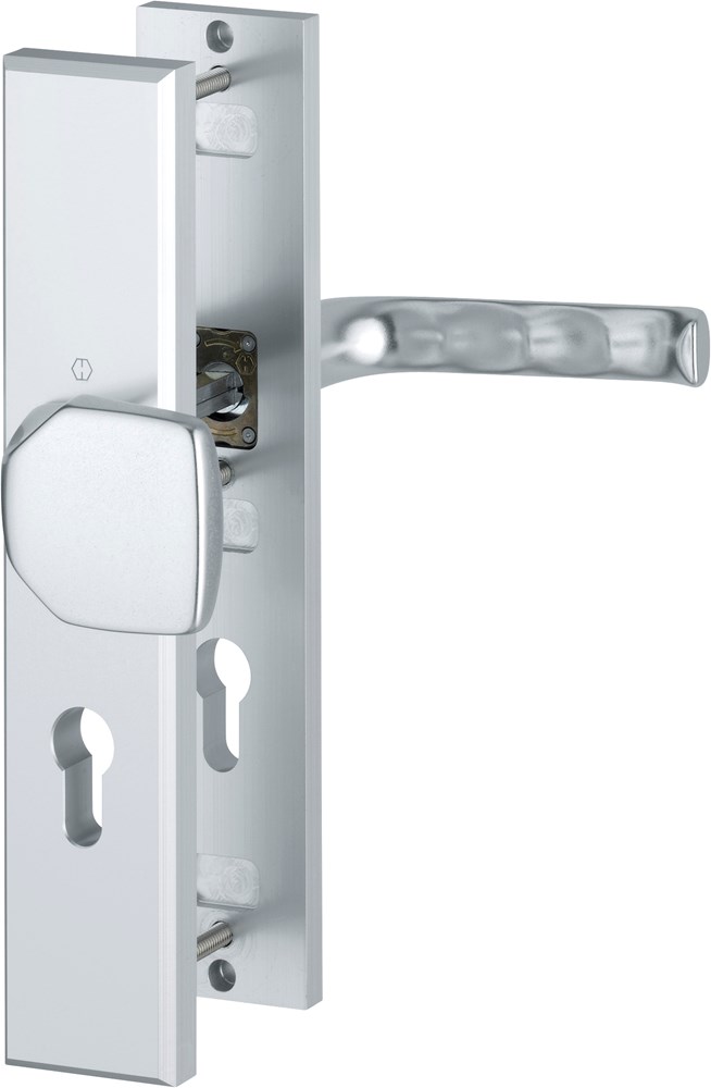 HOPPE rechthoekig inbraakwerend voordeurgarnituur van massief aluminium, met rondom facet, conform NEN 5089, SKG®***-keurmerk. Buitenzijde met verkropte vaste knop, met HOPPE-FDW-profielwisselstift en stalen nokken. Binnenzijde voorzien van hooghoudveer en met zichtbare bevestiging met 3 x M6 kruiskop Bouten en deurkruk-gatdeel.